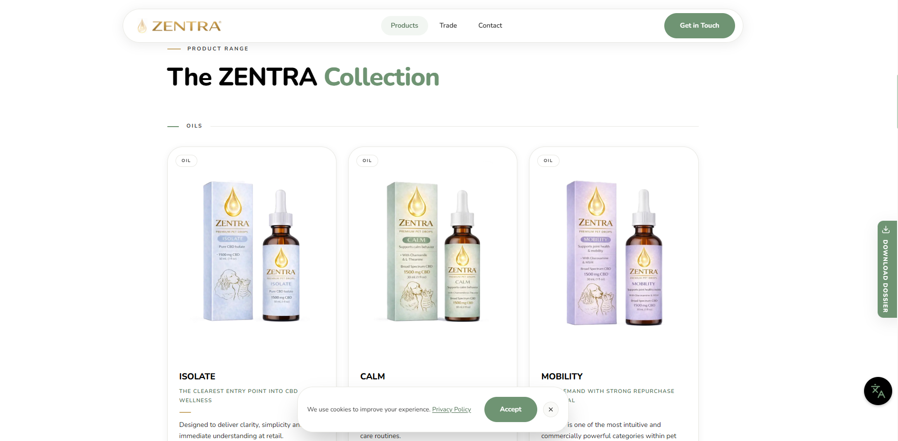 Landing page premium para marca cannabinoide de bienestar animal orientada a B2B. Diseño minimalista con enfoque en confianza regulatoria y retail-ready positioning para el mercado USA.